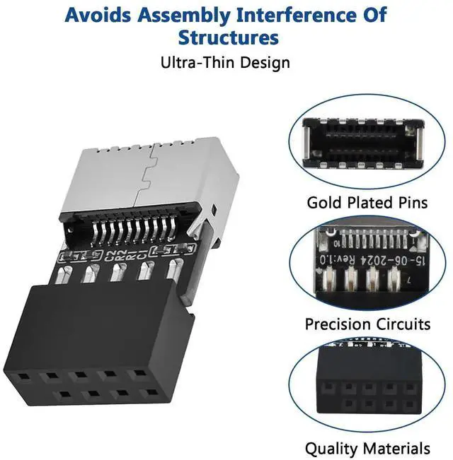 This motherboard header adapter converts a traditional 9pin USB 2.0 male connector to a USB 3.1 TypeE AKey female port, allowing you to expand a highspeed USBC port on your PC front panel. It supports USB 3.2 Gen 1 stable transmission, fits most mainstream desktop motherboards and chassis setups. Made with high-quality durable materials for secure internal connection and long-term stable performance. Lightweight and space-saving, it is a cost-effective DIY accessory for PC building, hardware upgrading and interface expansion.