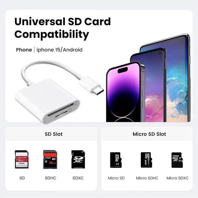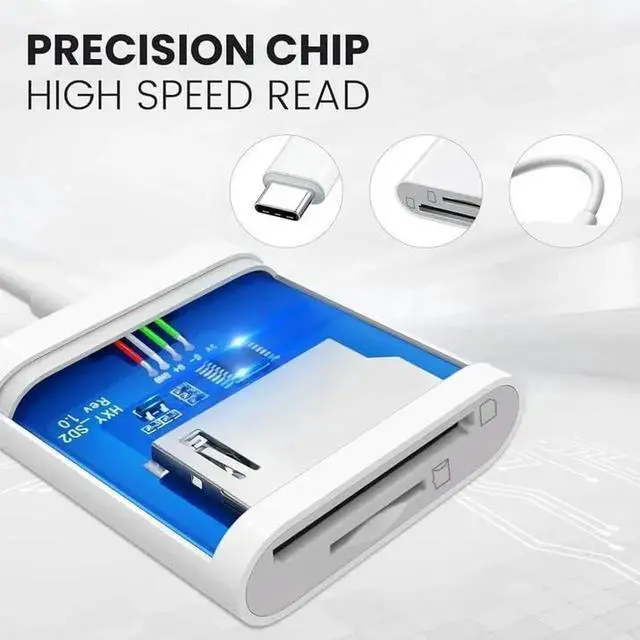This 2-in-1 USB-C memory card reader features dual slots for standard SD and Micro SD/TF cards, offering convenient one-stop data access for cameras, drones and daily storage cards. Built with USB 3.0 high-speed transmission technology to accelerate file copying, image browsing and video exporting. Ultra-slim portable housing is easy to carry and store, perfect for travel, photography and office work. No driver required, simple plug-and-play operation. Fully compatible with mainstream USB-C smartphones, tablets and laptops, a practical multiport accessory for quick memory card data transfer anytime.