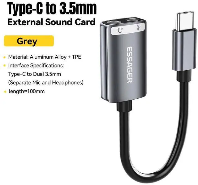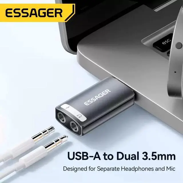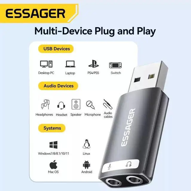 Essager USB Audio Adapter includes a stereo headphone output jack and a mono microphone input jack. It can bypass the defective sound card or the faulty 3.5mm audio port of your laptop/desktop system and regain the audio function for you. Save the cost of replacing a failed sound card.