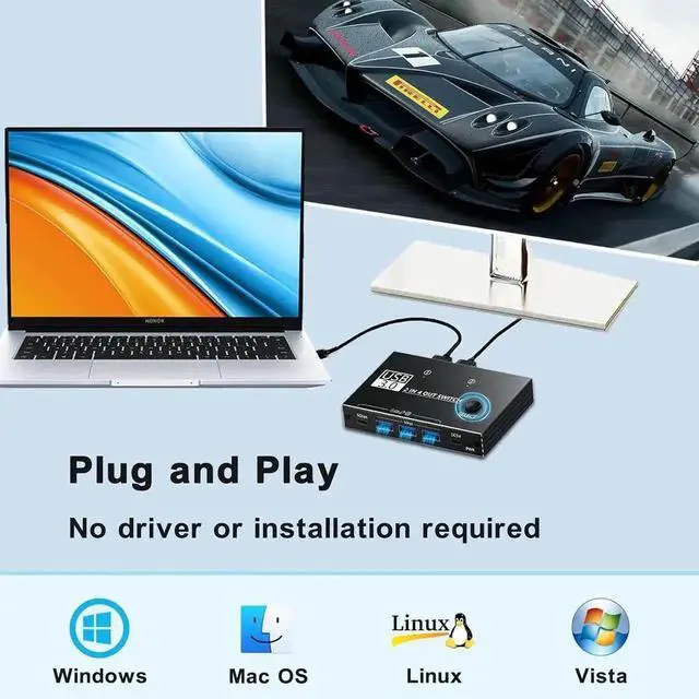 4. This is a USB C switch, not a KVM switch, and doesn't support monitors; USB-C input doesn't support video, and there is no HDMI input.