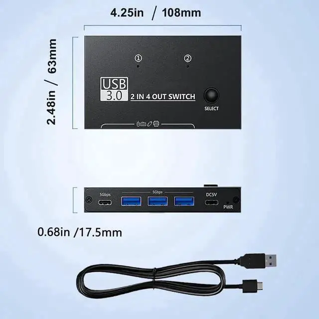 Package includes: 1 x USB switcher, 2 x USB-A to USB A cables, 1 x USB-C to USB-A power cable.