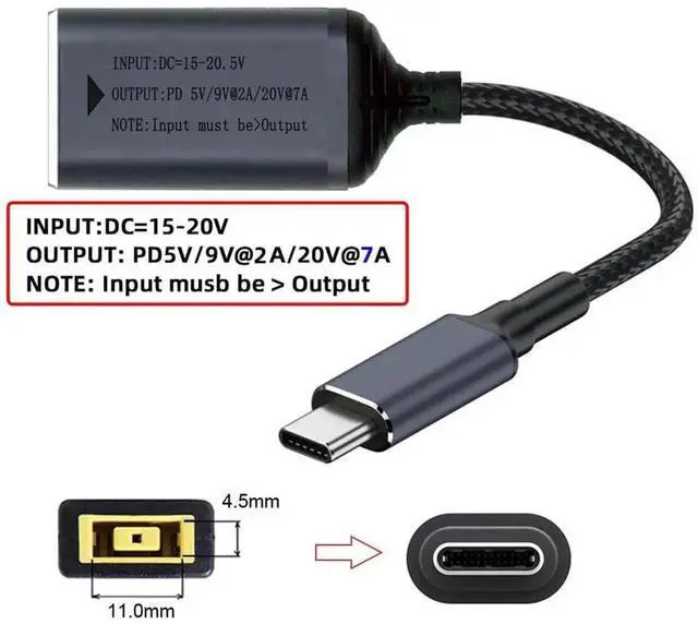 Thinkpad X1 Rectangle Jack Input to Type-C USB-C Smart LED Display Power 140W Charge Cable for Laptop Phone PD9V 5V 20V7A