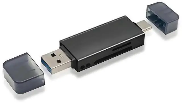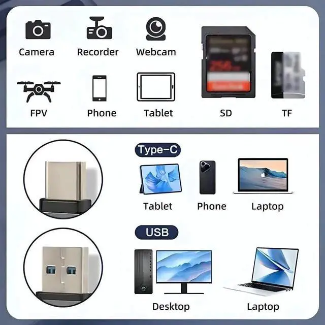 2-in-1 Card Reader,The USB-A and Type-C SD Card Reader features dual card slots and Type-A/C port, enabling simultaneous data transfer from SD, microSD, and USB devices at up to 5Gbps. Transfer photos, videos, and files fast, No need to swap devices.