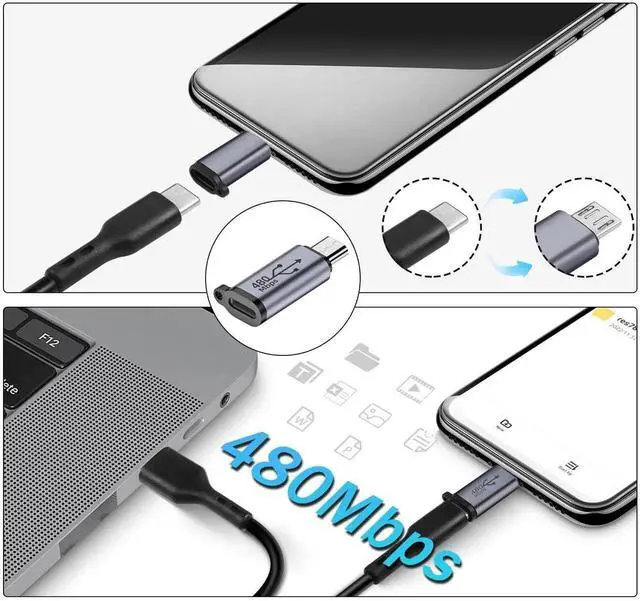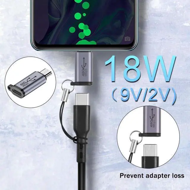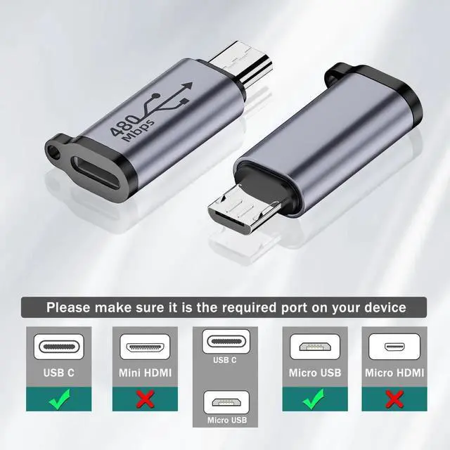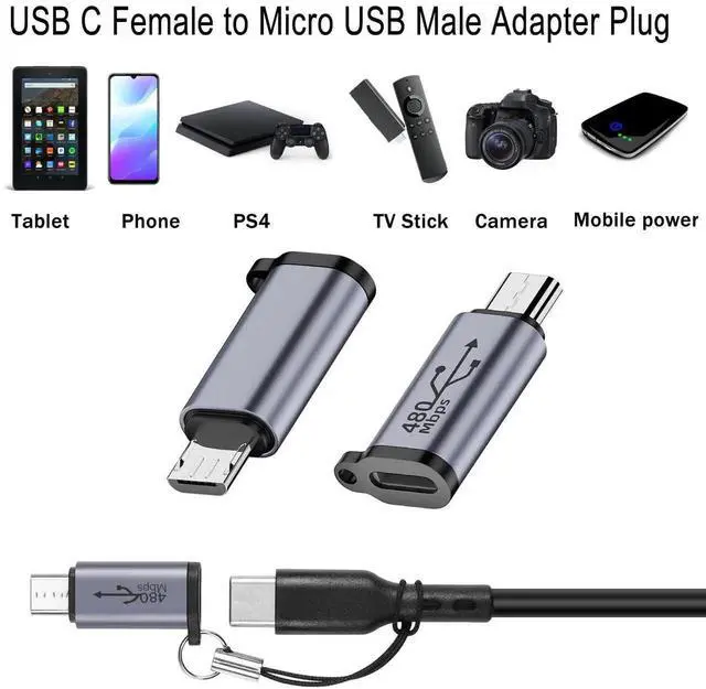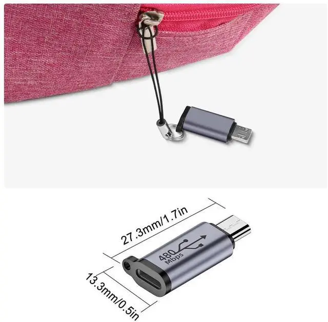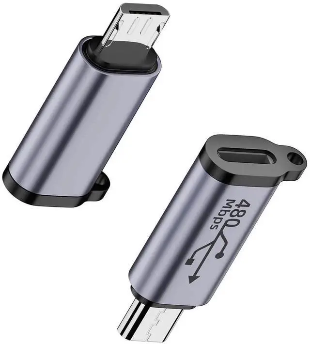 Micro USB 2.0 Male to USB C Female Charging Data Adapter converts the USB C port to Micro USB output, allowing existing USB C chargers to charge Micro USB devices. It is delicate and compact, does not take up space, and can be left in the Micro USB port of the device to avoid wear and tear on the port due to multiple unplugging. Widely used for cell phones, rechargeable batteries, speakers, bluetooth headsets, cameras, MP3, MP4, digital cameras, car recorders and more. Aluminum alloy shell, sturdy and durable. With hanging hole, easy to hang, not easy to lose.