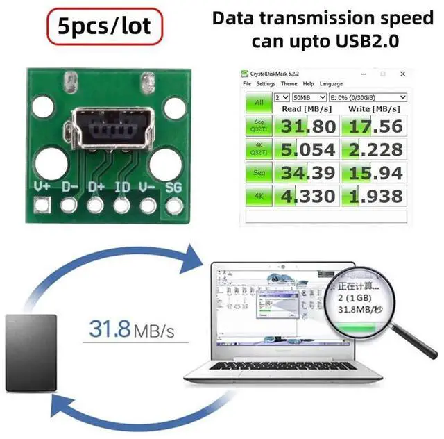 DIY OEM USB2.0 Mini-B Female Receptacle Socket Connector Vertical with PCB Mounting Assembly Solder Type 480Mbps 5pcs/set