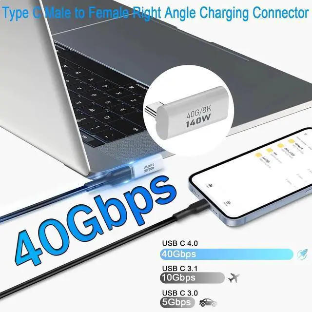 90 Degree Right Angle connector extender. Right angle vertical bend design, suitable for extending and expanding the Type C port of the device in a small space. Can be left on the port to protect the port from damage due to daily use. Suitable for PD fast charging, data transfer, headset, video calling, screen casting, OTG, compatible with Thunderbolt 3, iPhone 15 series, Tablet PC, MacBook, NDS Switch, Steam Deck, Samsung, Huawei, Xiaomi, oppo, vivo, OnePlus, Lenovo and so on. Aluminium alloy shell, sturdy and durable, easy to dissipate heat. White baking paint, exquisite appearance.