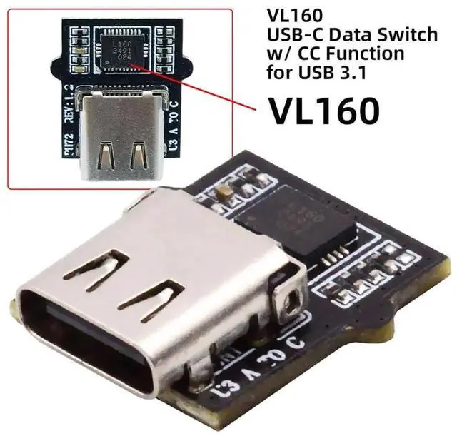 Build-in VL160 chipset. VL160 is USB Type-C 2:4 differential channels mux switch and integrated CC logic function for USB 3.1 type-C application, for mux switch signal performance supports up to USB 3.1. VL160 integrated internal power switch support Vconn 5V supply and with over current protection.