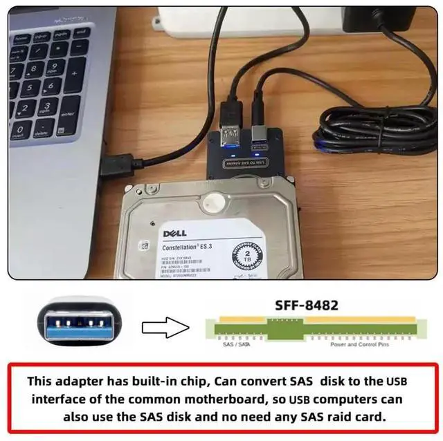 This adapter has built-in chip, Can convert SAS disk to the USB interface of the common motherboard, so USB computers can also use the SAS disk and no need any SAS raid card.