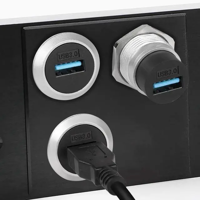 USB 3.0 recessed panel mount coupler a ruggedised and easy-to-install connection system suitable for mounting on dashboards, desktops or equipment operating panels. Meets the special needs of certain harsh industrial environmental conditions. Widely used for Ethernet connections for automation, medical, smart home and other devices. Simply cut a 23mm hole in the dashboard or equipment board surface and install it by nut fixing. Equipped with anti-loosening washers to avoid loosening caused by equipment vibration. It is also equipped with a dust cap to prevent dust and debris from entering and keep the inside of the port clean.