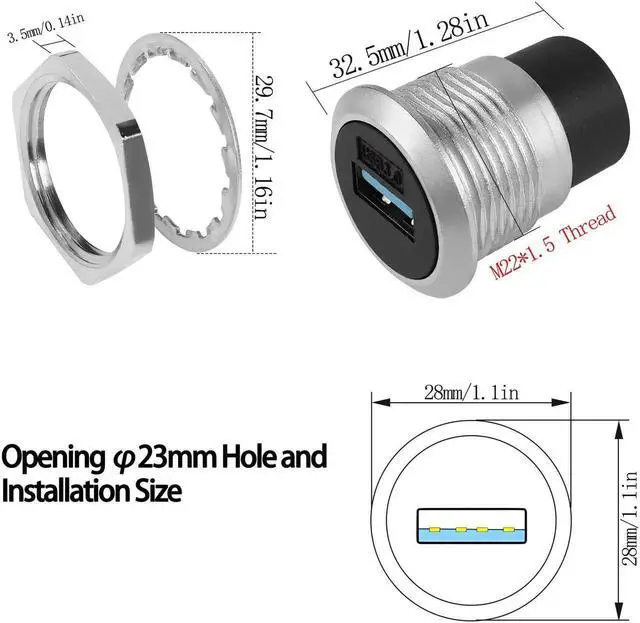 Package: 1*USB3.0 threaded fixed panel mount adapter, 1*M22 hexagonal nut, 1*loose washer, 1*dust cap