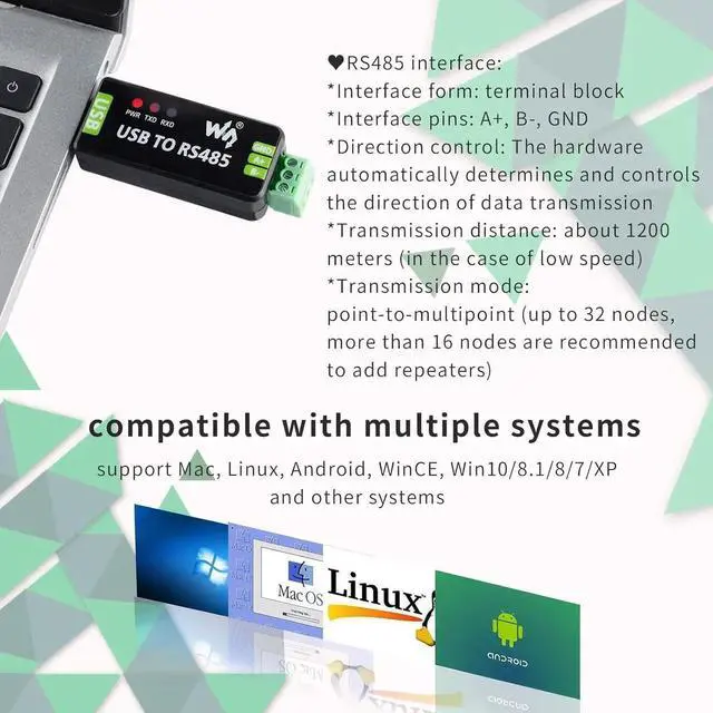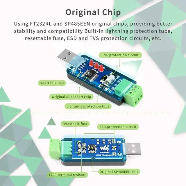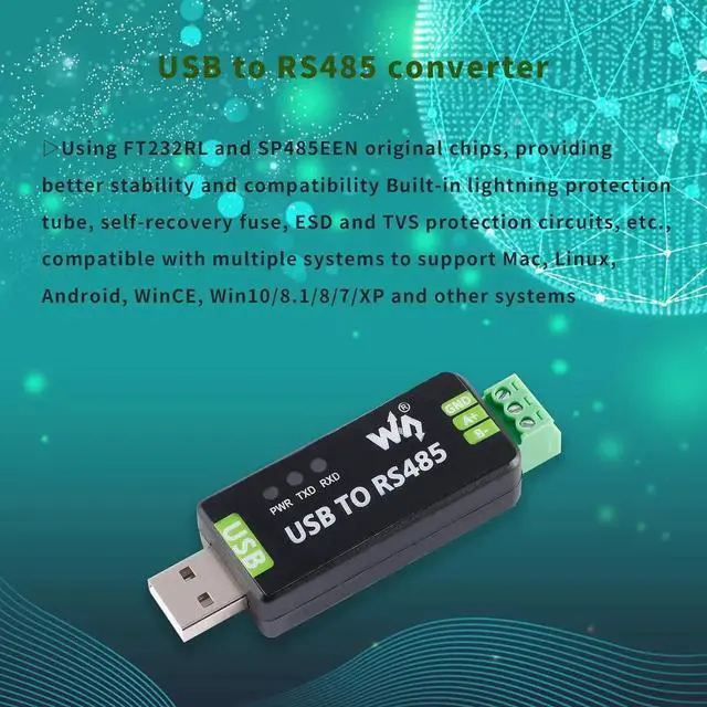 ? This product is an industrial-grade USB to RS485 converter using two original chips FT232RL and SP485EEN with stable communication providing better stability and compatibility. Built-in lightning protection tube resettable fuse ESD and TVS protection circuits are suitable for Various industrial control equipment or applications with high communication requirements.?