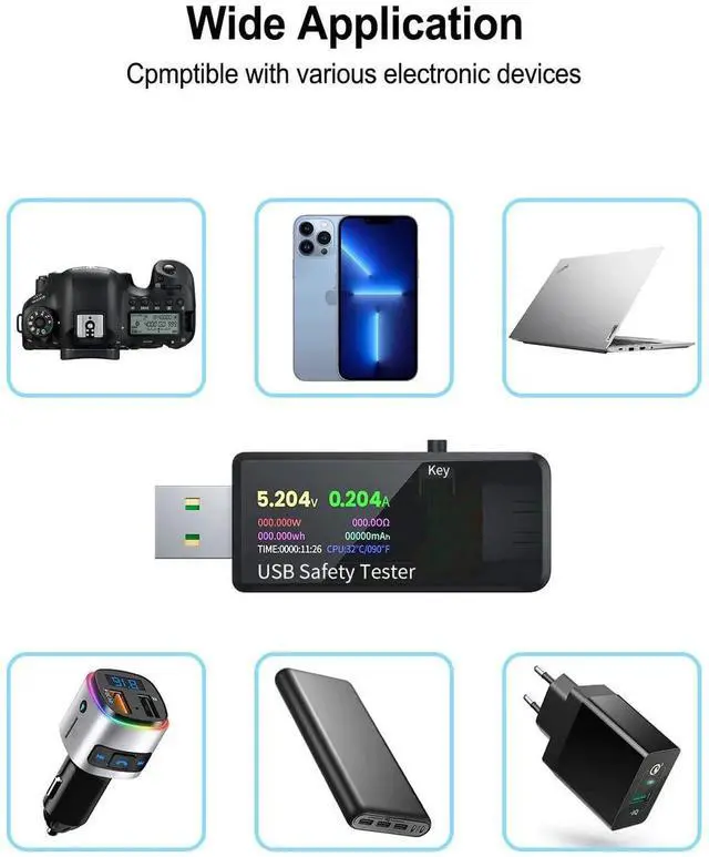Measuring voltage: 3.7-30V Measuring current: 0-6.5A Capacity measurement range: 0-99999mAh Energy measurement range: 0-99999mAh-999.99Wh Load impedance measurement range: 1-9999.9 Temperature measurement range: 0°C-65°C / 32°F-149°F Operating temperature range: 0°C-45°C / 32°F-113°F Product size: 64mmx22mmx12mm Display screen: 0.96 inch color LCD Voltage measurement resolution: 0.01V Current measurement resolution: 0.001A Voltage measurement accuracy: ± (0.1% + 2words) Current measurement accuracy: ± (0.2% + 4 words) Power measurement range: 0-120W Refresh rate: 0.5Hz Package Including 1 * USB Tester