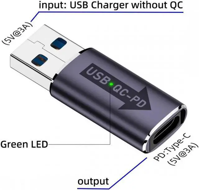 Input Type-A 5V 3A charger without QC and output 5V3A Type-C PD Power. (Green Led will be light)