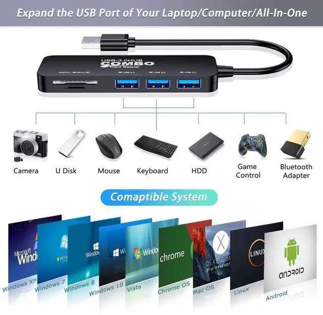 [Wide Compatibility]: This 5 in 1 docking station applies to various devices: laptop, pc tower, XBOX, PS4, flash drive, keyboard, mouse, card reader, HDD, cellphone OTG adapter, printer, camera, USB fan and USB cables.