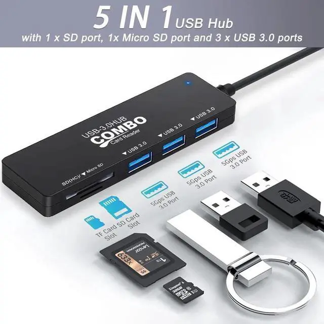 [5 in 1 Multifunctional HUB]: KEHIPI USB 3.0 hub with 5 interfaces: 1 USB 3.0 port, 2 USB 2.0 ports, SD/TF card readers. With this USB hub, you can extend one of your computer USB port into three, which means you can connect three USB peripherals simultaneously, such as keyboard, mouse, printer, USB disk and etc. And the other 2 slots are for your SD memory card and micro SD memory card.