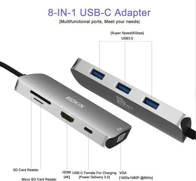USB-C Hub (8-in-1): Extend one 4K UHD HDMI port, 3 supper speed USB 3.0 ports, one SD menmory card slot and one TF momory card slot, VGA slort, USB-C Power Pass-through Slot from one USB-C/thunderbolt 3/ type c port