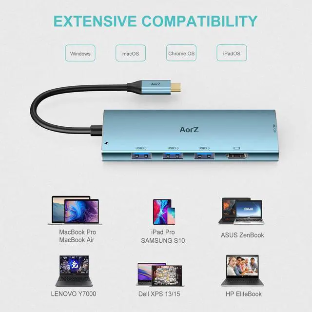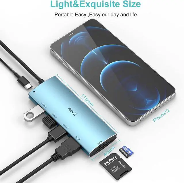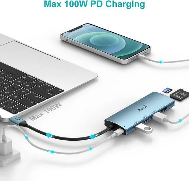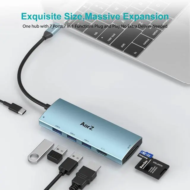 USB C Hub, USB Hub to HDMI Multiport AorZ USB c Dongle Adapter 7 in 1 with 4K HDMI Output, 3 USB 3.0 Ports,SD/Micro SD Card Reader, 100W PD,Compatible with Macbook,XPS and More Type Device(Light Blue)