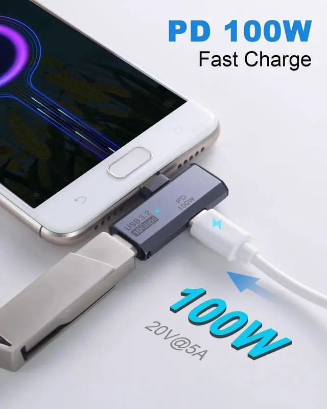 The 90 Degree USB C splitter charger adapter complies with the USB 3.2 standard, with data transfer speeds up to 10Gbps. Transferring files, movies, music, etc., can be completed in just a few seconds. The perfect compact right-angle design keeps cables neat.