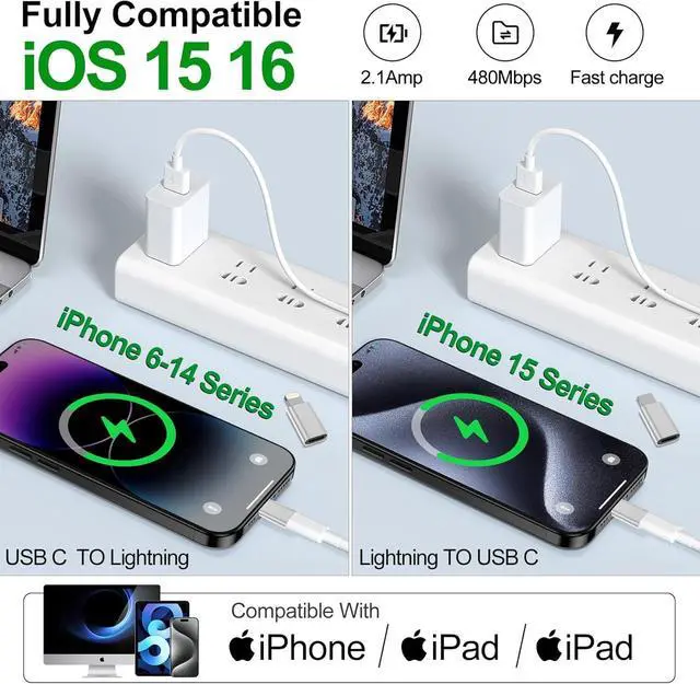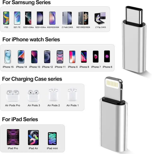 Compatible with iPhone 15/15 Pro/15 Pro Max/15 Plus with Google Pixel 7/6/5/4 with Galaxy Z Flip 5 with Galaxy Z Fold 5 with Galaxy S23/S23 Ultra/S23+/S22/S21/S21 Plus/ S20/Note 20/ 20 Ultra/ 10/ 10 Plus with HTC U12 with LG V50 and other devices that are using USB Type C cable. USB C Female to Lightning Male Adapter CompatibilityCharges your i-OS devices via a Type-C cable saving the trouble of carrying an extra lighting cable. The Type C to lightning adapter is compatible with iPhone14/13/12/11/SE/X/XR/XS/8/7/6/6s/Pro Max Plus mini with iPod Nano 7 with iPod Touch 5 with iPad 9/8/6/5 with iPad Pro with iPad Air 1/2/3 with iPad mini 5/4/3/2 with Airpods 1/2/3 and with etc.