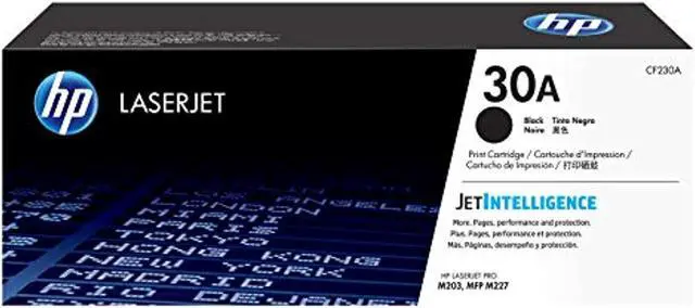 HP 30A (CF230A) Black Toner Cartridge for HP Color LaserJet M203 M227. HP 30A (CF230A) toner cartridges work with: HP Color LaserJet M203, M227. Original HP toner cartridges produce an average of 71% more usable pages than non-HP cartridges. HP 30A toner cartridge yield (approx.