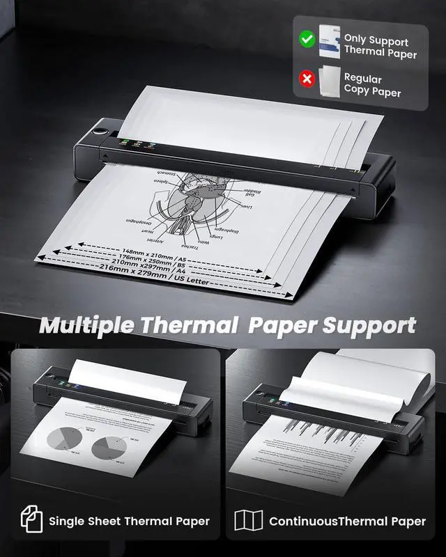 dvanced Upgraded Print Head with Dual-Zone Precision: This portable thermal printer tray for phone utilizes cutting-edge thermal direct technology featuring an upgraded print head with dual-zone heat control and ±0.1°C temperature lock. Achieves 99% uniform print density for crystal-clear documents, delivering sharper results than standard mobile printers