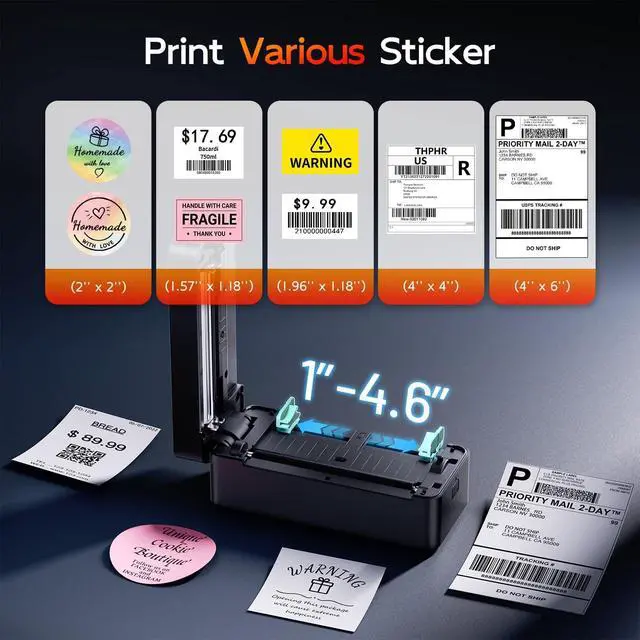 Advanced Chip Technology: Powered by advanced chip technology, 4x6 thermal printer comes with automatic calibration, greatly reducing label misalignment issues. Its compatible with thermal labels from 1" to 4.6" wide, including all popular sizes: 4x6 (the most common shipping label size), 3x2, 3x1, 2x2, and 2x1. Perfect for shipping labels, barcode labels, Christmas gifts label and product tags, it delivers accurate, professional printing to keep your shipping and inventory tasks running smoothly.