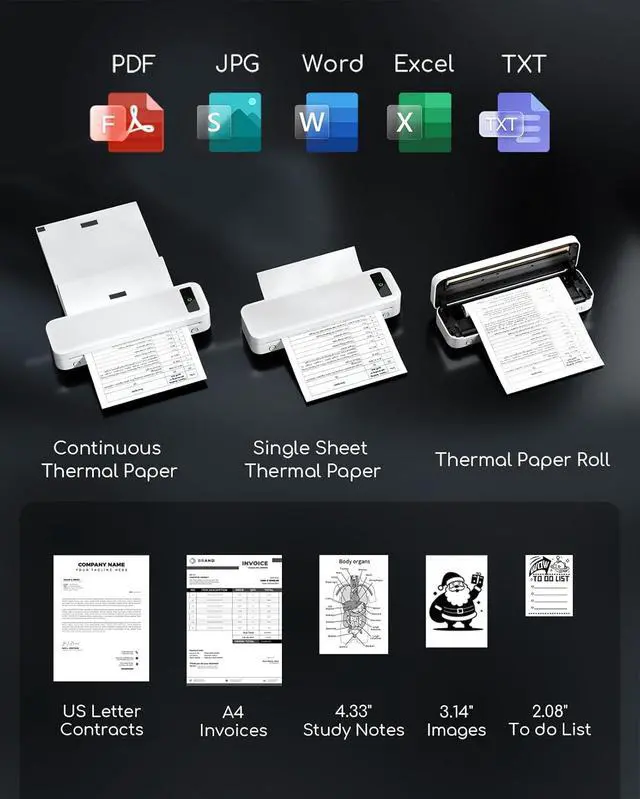 Thermal Printer [Multi-Size Printing]: The wireless portable printer with built-in paper bin, support thermal roll paper, continuous and single sheet thermal paper. This small wireless printer also supports 5 sizes of thermal paper: 8.5 X 11 US Letter, A4, 4.33'' (110mm), 3.14'' (80mm), 2.08'' (53mm) width thermal paper, can meet most of your needs