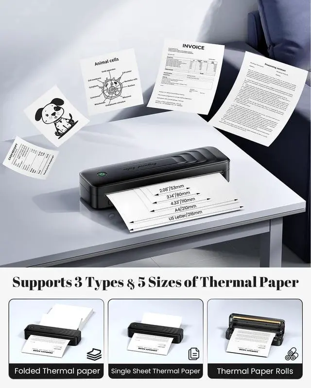 Versatile Thermal Paper Support: Inkless printer is compatible with five different paper sizes (US Letter, A4, 4.33'', 3.14'', 2.08'') and three types (roll, fold, and ordinary thermal paper), meeting the diverse needs of users for note-taking, exams, documents, and DIY projects.