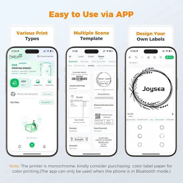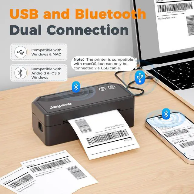 Bluetooth Wireless Connection: Joysea Y43BT Bluetooth label printer features seamless wireless printing. It supports iOS, Android, and Windows (note: Mac is only compatible via USB). Whether youre printing from a desktop, laptop, or smartphone, this Wireless label printer delivers stable, hassle-free connections. This 4x6 model is ideal as a Bluetooth thermal shipping label printer for home use or small business.