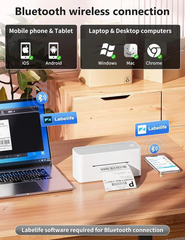 [Print Wirelessly] - Phomemo bluetooth shipping label printer supports wireless printing through bluetooth connection. For IOS and Android, need to download the "labelife " APP from Apple Store or Google Play. With easy and simple operations, you can easily print your documents, photos, and more, making your life more convenient! Note: All devices cannot be directly connected to Bluetooth and need to be used through the app