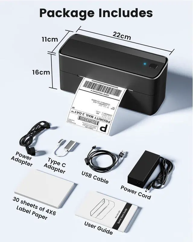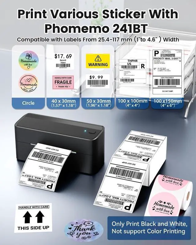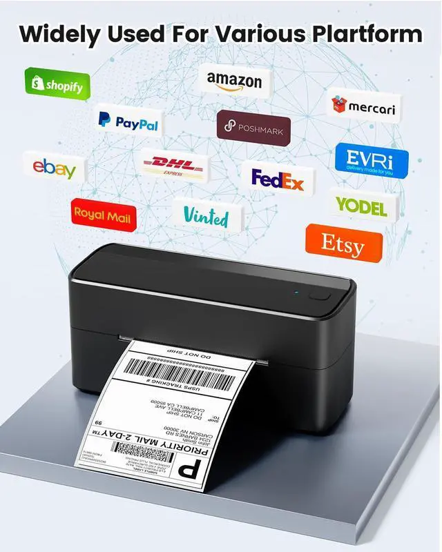 [Multi-Platform Compatibility] - This shipping label printer supports label widths from 1 to 4.6 inches, making it ideal for printing labels from major platforms like eBay, Shopify, Amazon, Etsy, UPS, USPS, FedEx, and more. Easily print text, barcodes, QR codes, forms, and use pre-made templates for home or business. Note: The printer supports black-and-white printing only. For color labels, purchase compatible thermal color label paper separately.