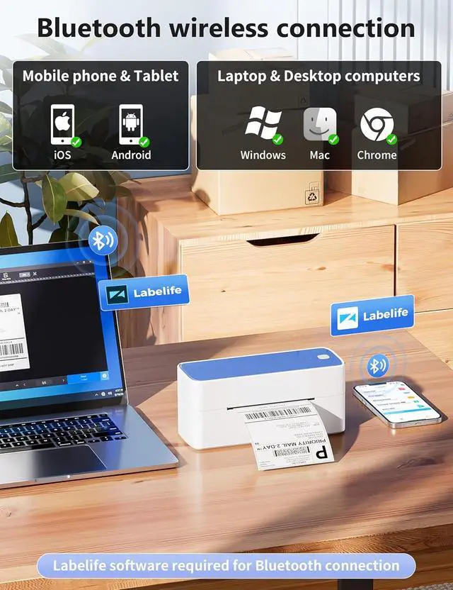 1. [Print Wirelessly] - Phomemo bluetooth shipping label printer supports wireless printing through bluetooth connection. For IOS and Android, need to download the "labelife " APP from Apple Store or Google Play. With easy and simple operations, you can easily print your documents, photos, and more, making your life more convenient! Note: All devices cannot be directly connected to Bluetooth and need to be used through the app