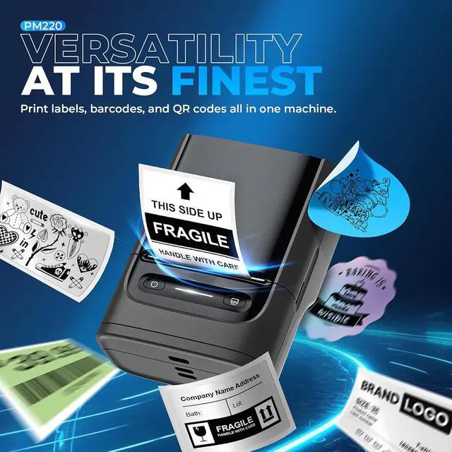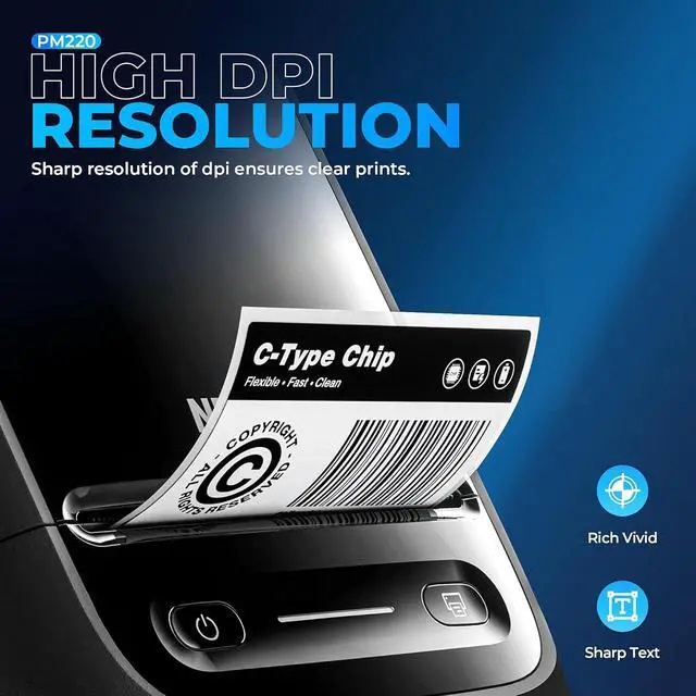 Portable- 2 Inch PM220 label maker machine with tape compatible with smartphone & PC. Easily connect label printer to your smartphone in just 5 seconds for fast and convenient printing, label printer achieves convenient, smooth & fasts printing. Mini compact design, you can bring this portable label maker machine with tape to anywhere.(Note: charging adapter not included, not suitable for fast charging adapter.)