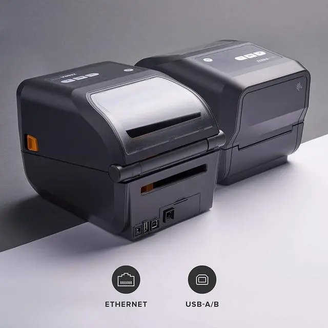 Ze bra ZD420T 300dpi Thermal Transfer and Direct Thermal Desktop Printer, Black - Ethernet, USB Connectivity - 4" Print Width, 4 IPS, Bar code Label Printer - ZD42043-T Printer_Cable
