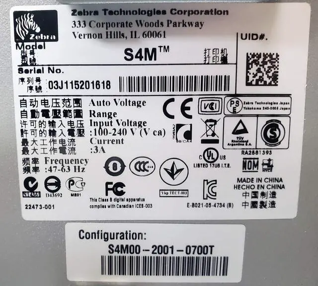Ze bra S4M Monochrome Direct Thermal/Thermal Transfer Industrial Printer, 6 in/s Print Speed, 203 dpi Print Resolution, 4.09" Print Width, 110/220V AC