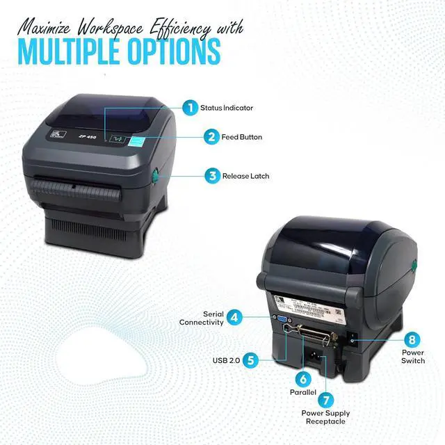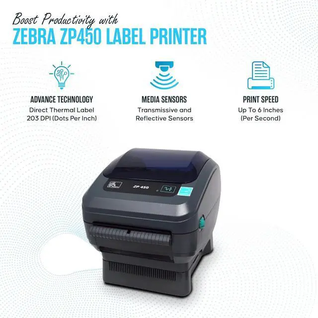 ZP450 Direct Thermal Label Bar code Printer -1 Year Warranty - ZP 450 with USB 2.0 Cable & 3 Prong Cord - USB, Serial and Parallel Connectivity 203 DPI Resolution