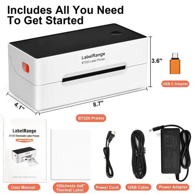 LabelRange BT320 Bluetooth Label Printer, power adapter/power cord/ USB cable, 100 sheets 4x6'' labels, USB-C adapter (for computers without a USB port), user manual