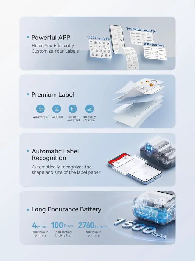 Powerful APP: The Versatile NIIMBOT App included more than support 10+ fonts/Languages, 100+ borders, and 1500+ symbols, barcodes, QR codes, icons, time, images,table and so on. Besides that, they are some pre-made templates in app, you can directly use or refer to them to design your own lables.