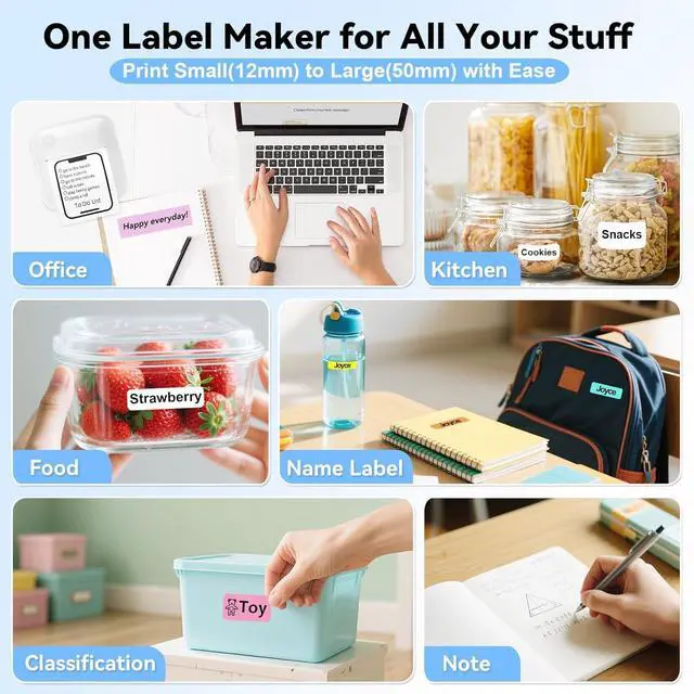Adjustable 12-50mm Wide Printing: Frustrated by traditional label makers limited to small labels? Our upgraded adjustable paper roller supports 12-50mm labeling (vs. traditional 14mm max)! Perfect for jars, folders, storage bins, large itemsno more unreadable tiny labels