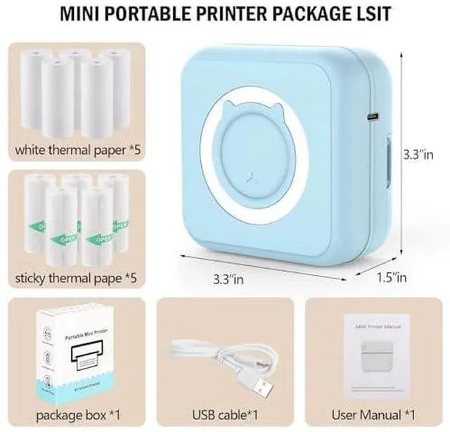 This inkless mini printer package comes with 1 portable mini printer, 10 rolls of 5 ordinary thermal paper and 5 sticker papers with 2.2" wide, 1 USB cable and 1 user guide, which is a great set to meet your diverse needs and they are enough for family use. Any questions about the mini bluetooth printer, please tell us for help.
