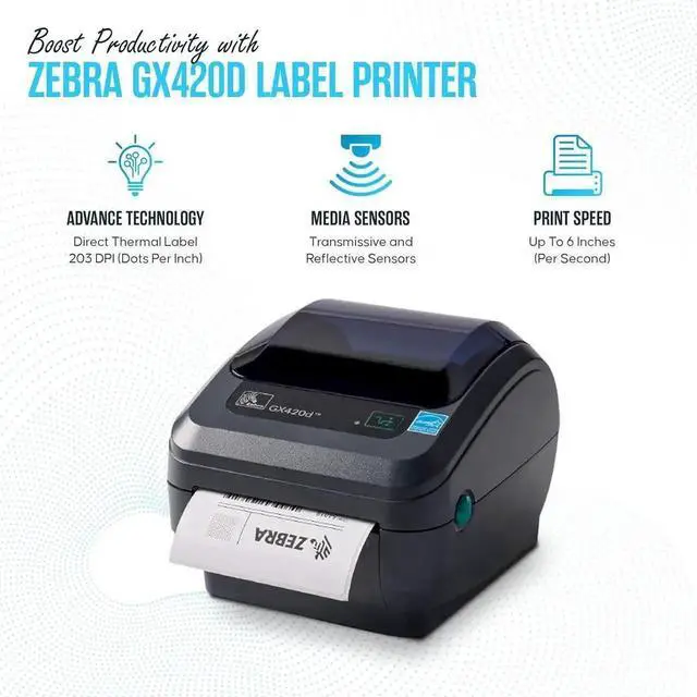 Ze bra GX420D Direct Thermal Label, Receipt & Bar code Printer - with USB 2.0 Cable, 4x6 Label Roll, 24V - USB, Serial and Ethernet Connectivity