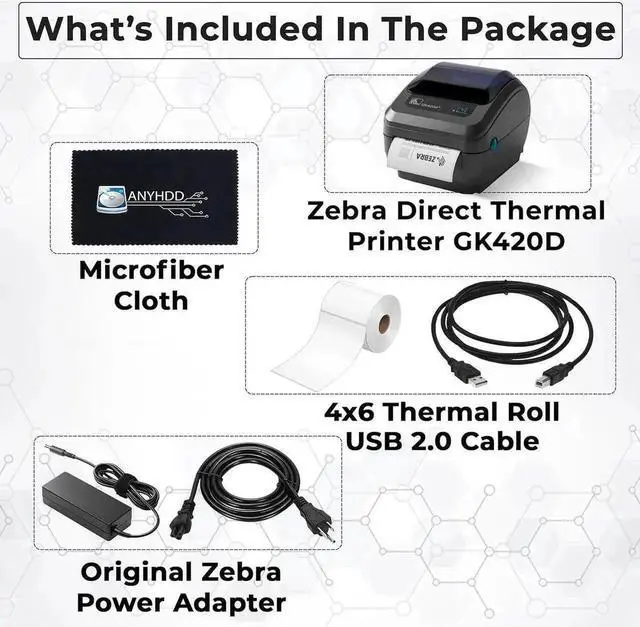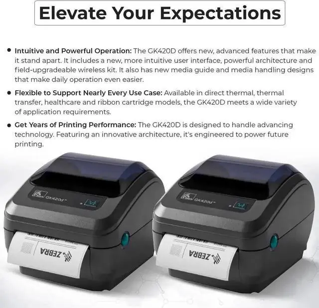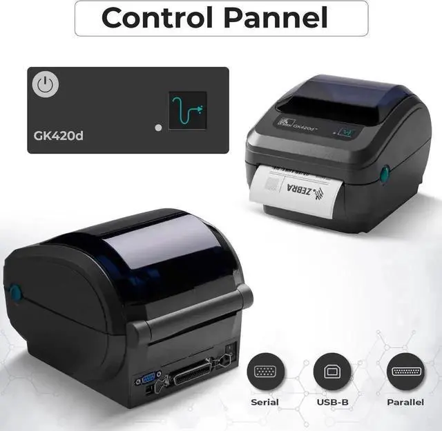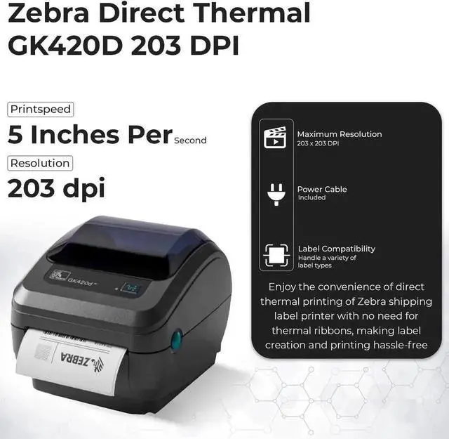 • GK420D Ze bra Label Printer Direct Thermal & Bar code Printer Bundle - 1 Year Warranty - Comes with 24V AC Adapter, 4x6 Label Roll, USB 2.0 Cable & Microfiber Cleaning Cloth - USB Connectivity