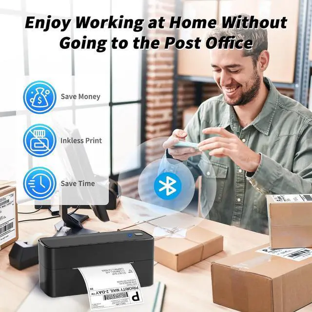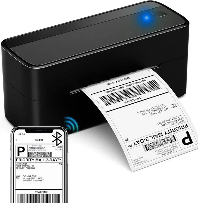 Portable Bluetooth thermal shipping label printer with fast wireless printing for 4x6 labels.