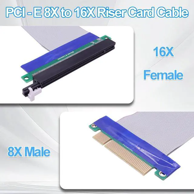 Pcie 16x extension cable is a PCI-E 8X male connector on one end and a PCI-E 16X female connector on the other end.