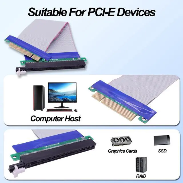 PCI-E Riser Cable supports high-speed PCIe adapters and devices, such as PCIe 8x 16x graphics cards, sound cards,disk controllers, SSD RAID controllers cards etc.