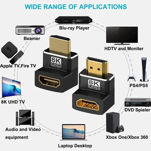Upgraded HDMI 2.1 Standard: Truely support for Dynamic HDR, AMD FreeSync, NVIDIA G-SYNC, eARC, Dolby Vision, HD Dolby 7.1, Dolby Atmos, BT.2020, ALLM, VRR, HFR, QMS, QFT, DSC 1.2 a Compatible with HDCP 2.3 to watch content protected videos. 8K Resolution: Supports 8K@60Hz and 4K@120Hz, provides resolutions up to 7680x4320 60Hz, backward compatible with 6K@60Hz, 5K@60Hz, 4K@144Hz, 2K@240Hz, 1080P@60Hz, etc. Supports 3D effects, bringing you a cinematic immersive visual experience. Suitable for Narrow Space: Combos of up down angle 90 degree and 270 degree HDMI adapters can be conveniently selected for actual needs, which is super handy for connecting HDMI cables at narrow space, It perfectly protects your cables from bending damage or breakage and also reduces the stress on ports of valuable devices. Premium Material: Adopt 24k gold-plated interface, precise internally soldered PCB and rigid outer aluminum shell provide 48Gbps stable signal transmission and durable using experience. Package Content: 2 Pack 8K HDMI 2.1 Male to Female Adapters (1 x 90 Degree and 1×270 degree).