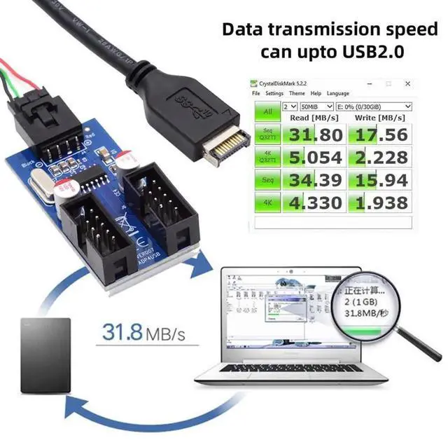 4) Cable Length 30cm; Type-E end is connected motherboard and the 4pin connect to device. USB2.0 support 480Mbps speed. Support DC 5v 500ma current for each port.