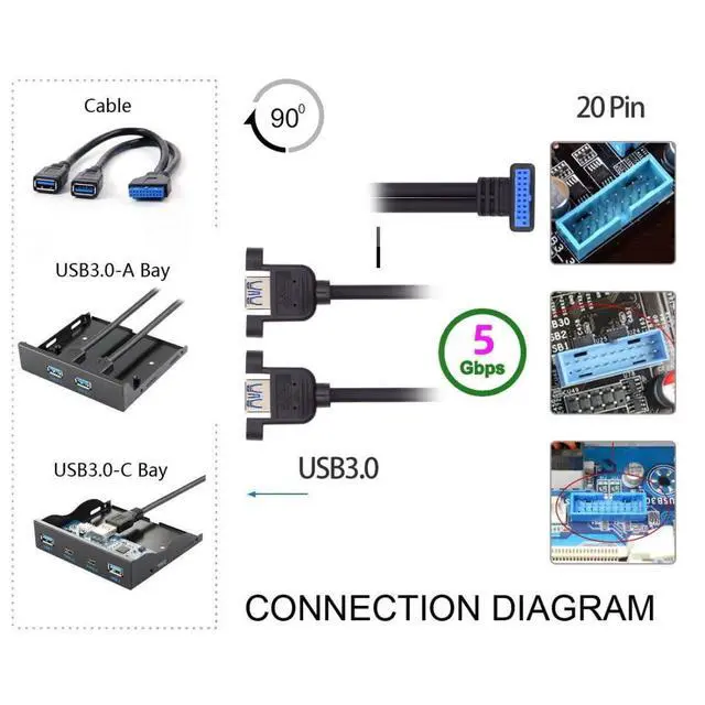 Vszerda 2 Ports USB 3.0 Female to Motherboard 20Pin Male Cable for Front Panel Screw Mount Type 30cm 90 Degree UP Angled