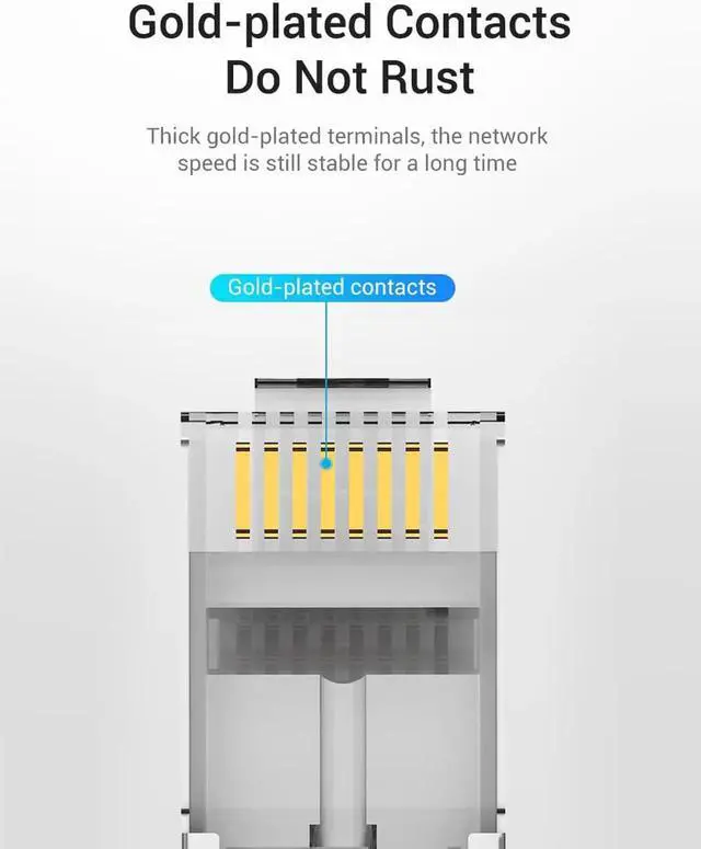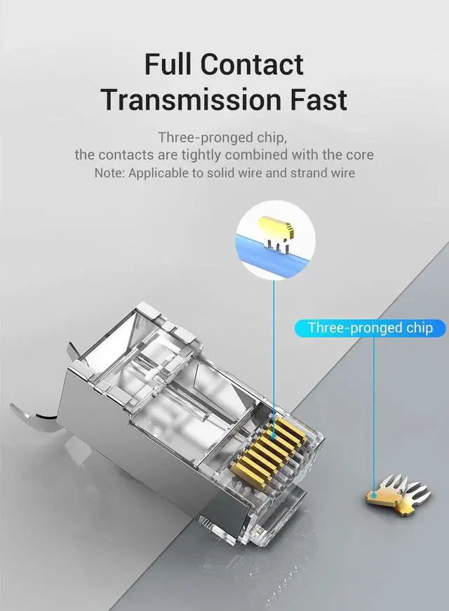 50 PACK CAT7 RJ45 CONNECTOR let you make ethernet cables in custom lengths without breaking the bank. Compatible with multi-stranded, single-stranded and solid cables, supporting CAT6A CAT7 round or flat cable. These RJ45 plugs work with virtually every model of CAT7 RJ45 crimping tool. (PLEASE COOPERATE WITH CAT7 PASS-THRU MODULAR CRIMPER)