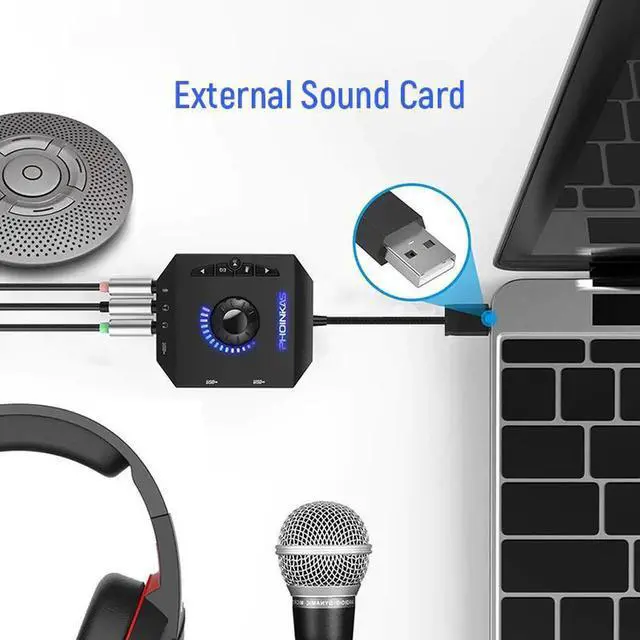 Multi-port sound card: The external sound card has its own audio chip, which can transfer one USB port to multiple 3.5 mm ports, so it can connect 3.5 mm audio devices such as headphones, headphones, speakers, microphones, etc. Supports single plug and dual plug headphones at the same time, no adapter is required.